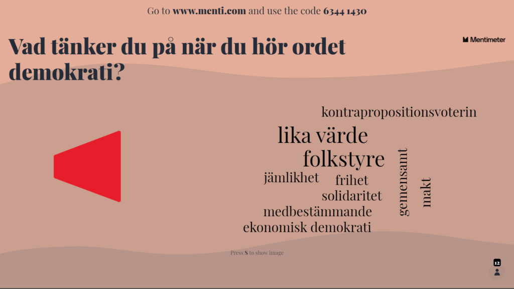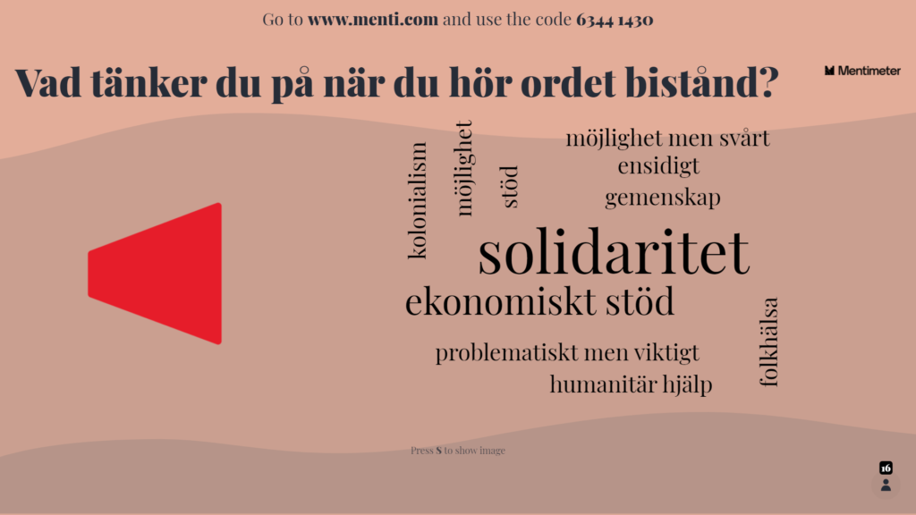 Svaren som inkom var spännande. Det är intressant att se olika perspektiv på ett och samma begrepp beroende på erfarenheter, intresse och förståelse kring området. Vi ser även att flera av de som medverkade i ord-molnet valde samma ord så som solidaritet för Bistånd och lika värde och folkstyre för Demokrati.